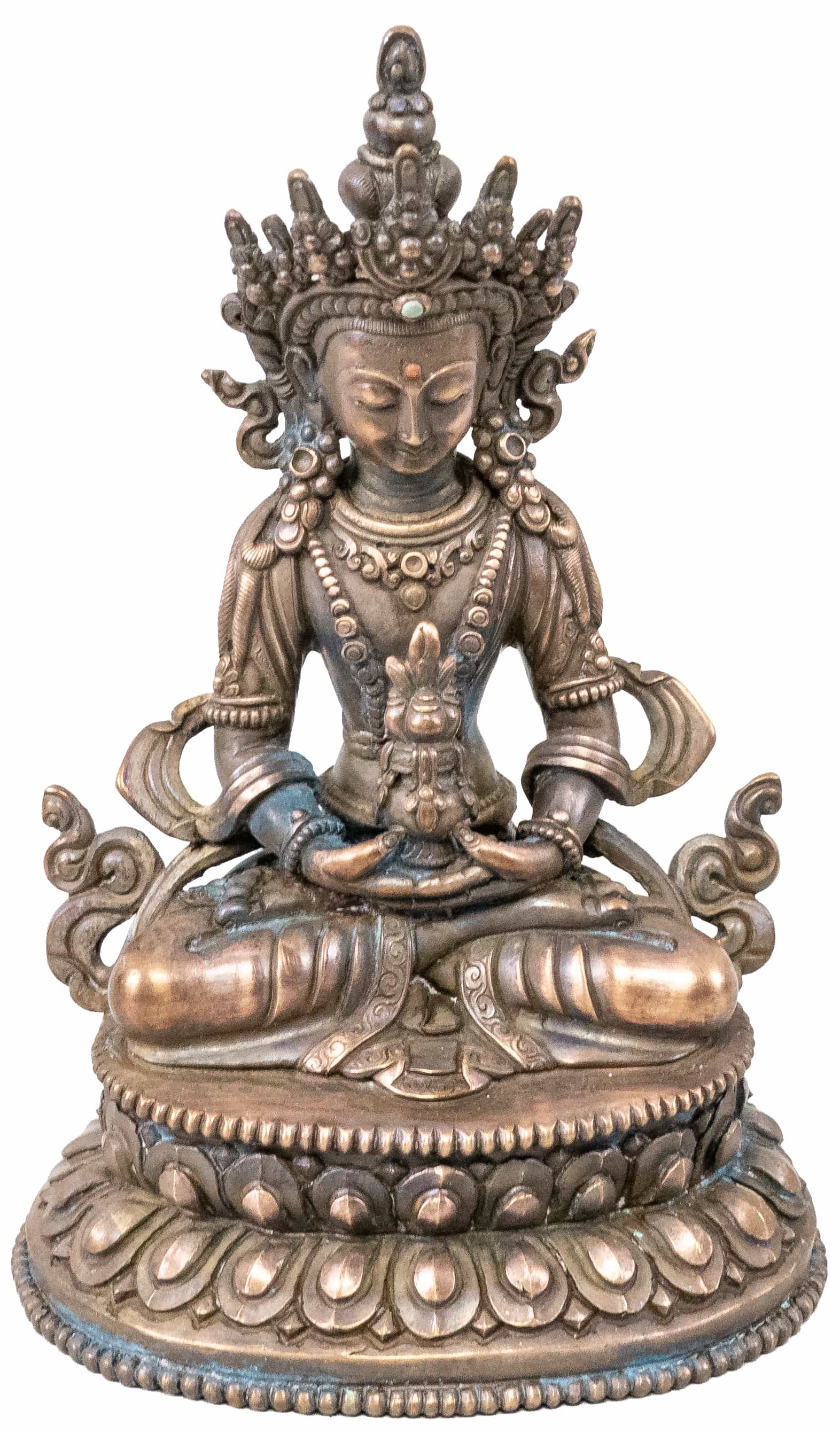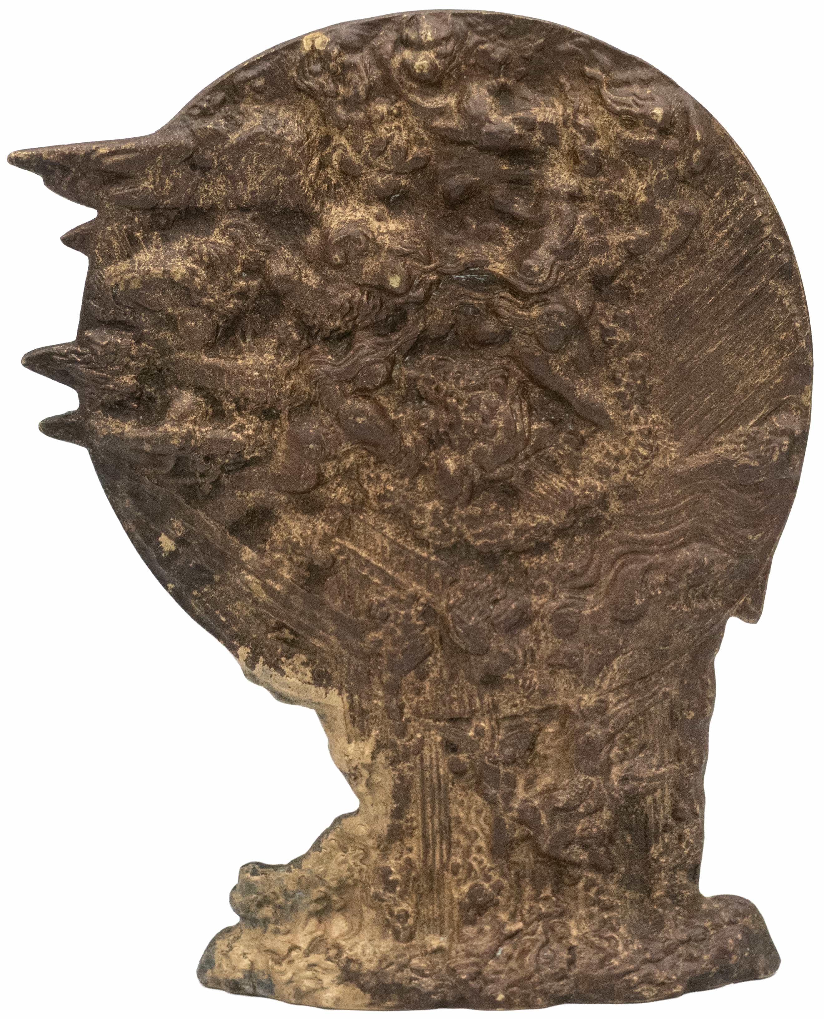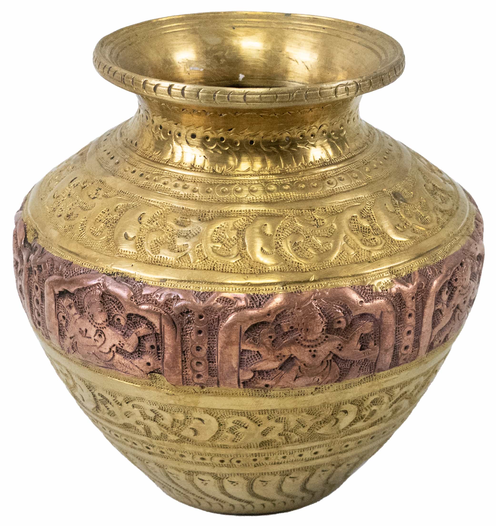01.06 Vas ornamental, bronz decorat în relief (friză) cu personaje budiste, H 12cm, Extremul Orient, jum.sec.XX, mică deformare