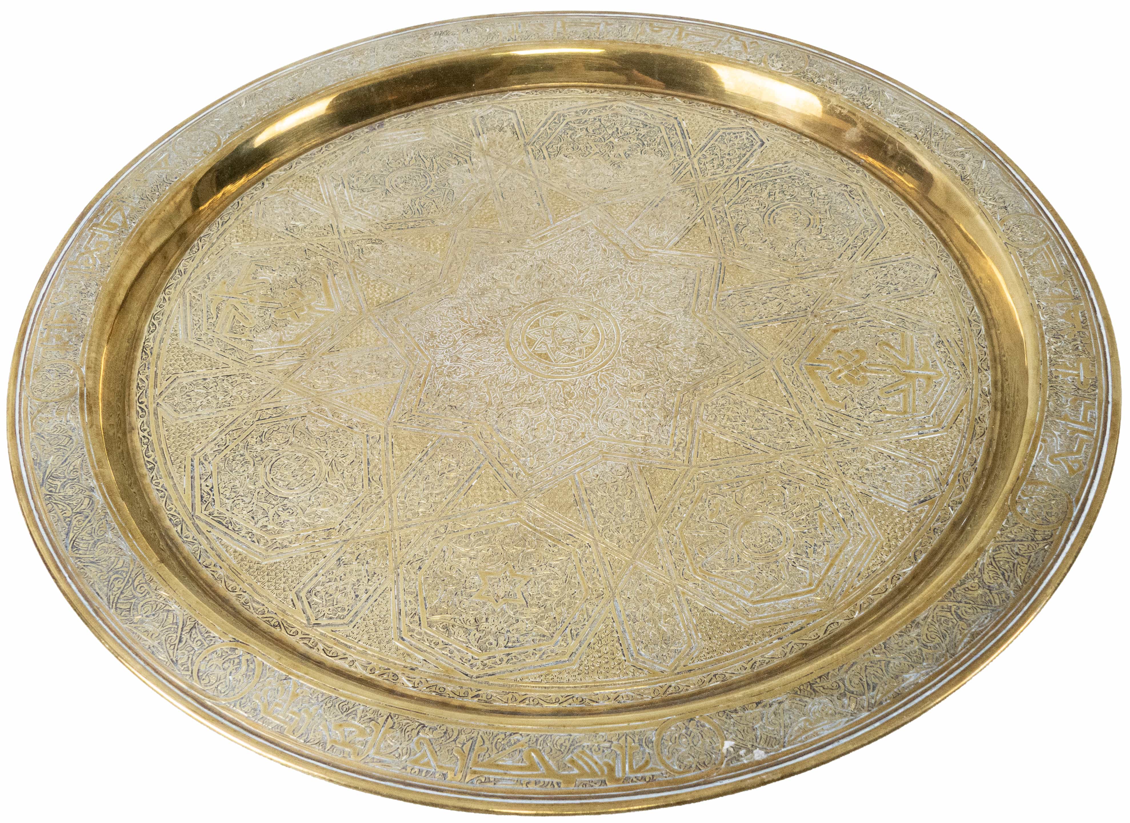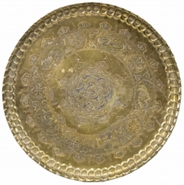 01.07 Platou rotund, decorat în relief cu elemente geometrice, inscripționat, bronz, dia.34cm, Orientul Mijlociu, jum.sec.XX