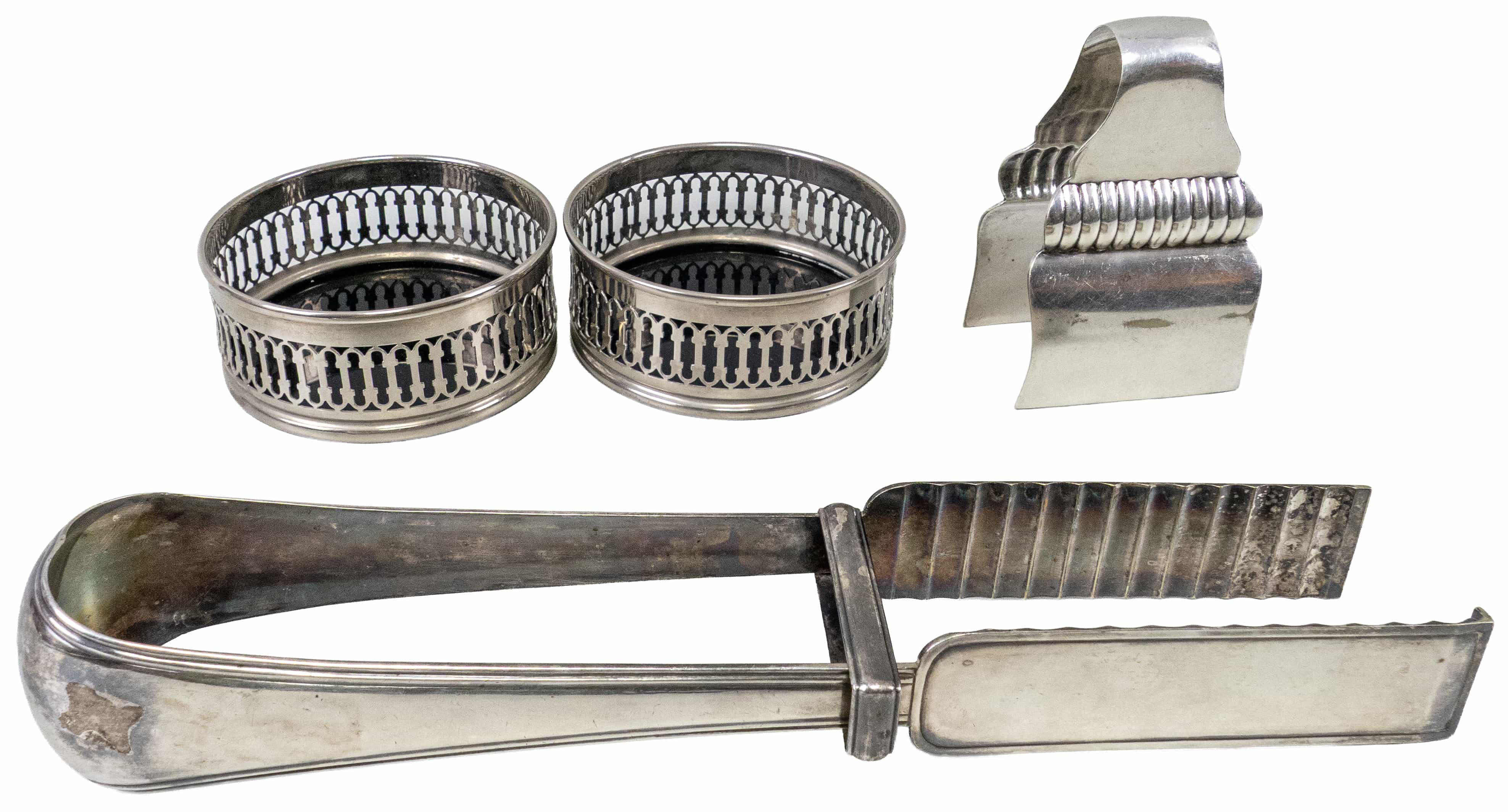 01.09 Doi clești pentru sparanghel și două suporturi pentru sticle, un clește marcat, metal argintat, jum.sec.XX
