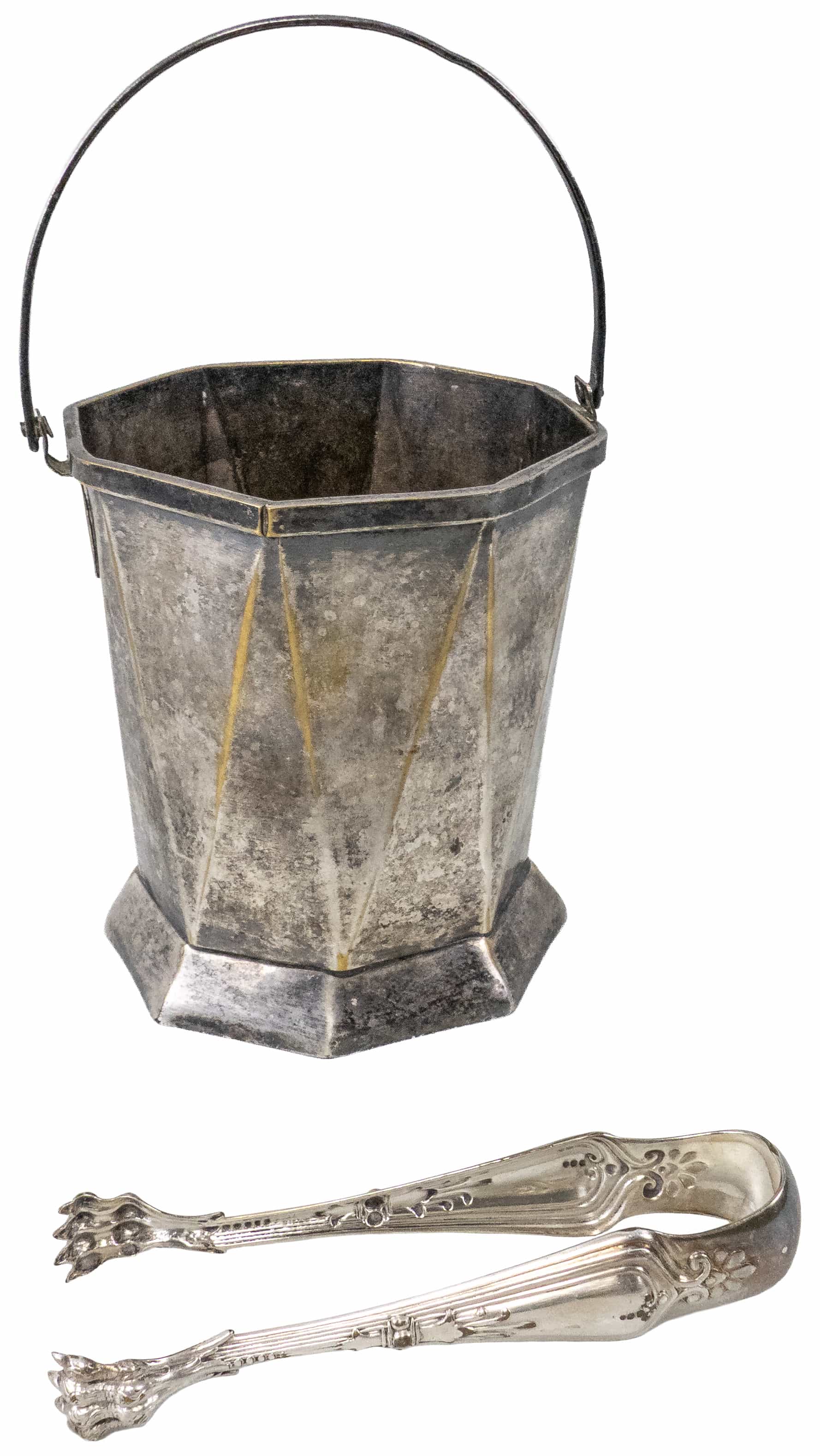 01.11 Vas pentru cuburi de ghetă și clește, alamă și metal, argintate. H 14.5cm, perioada interbelică