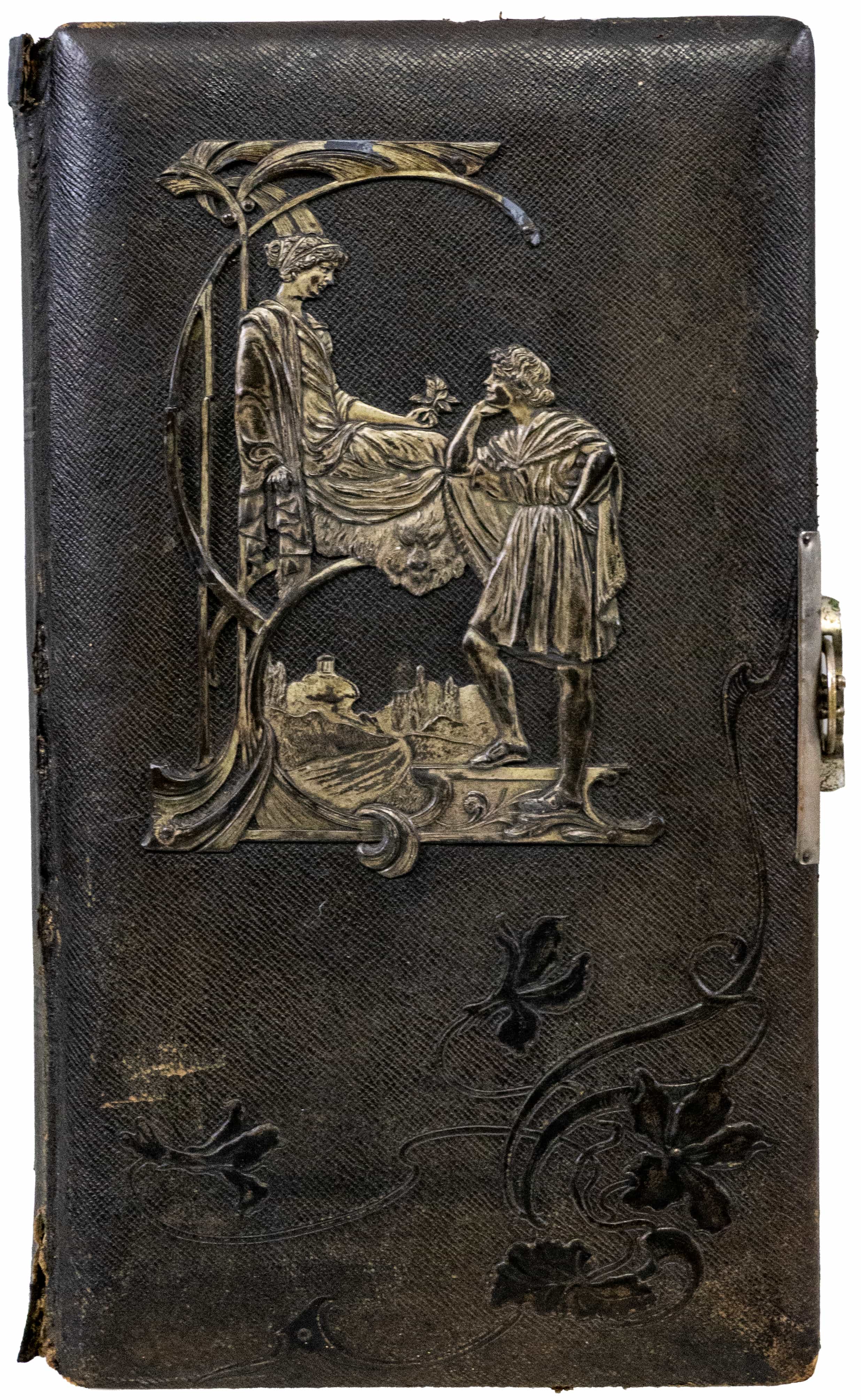 01.14 Album foto, piele decorată în relief, aplicație de metal, accesorii metalice, elemente Art Nouveau, 34x20cm, cca.1900, coperta restaurată