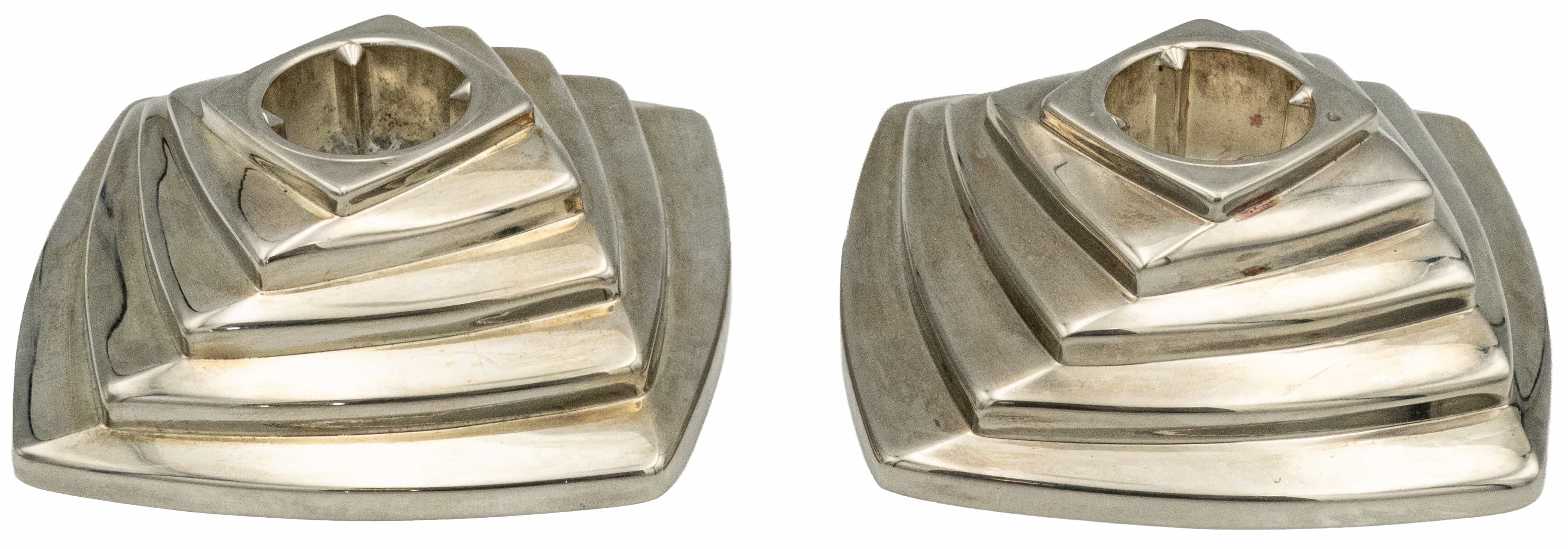 01.15 Pereche de suporturi pentru lumânare, metal argintat, stil Art Deco, H 3.5cm, perioada interbelică