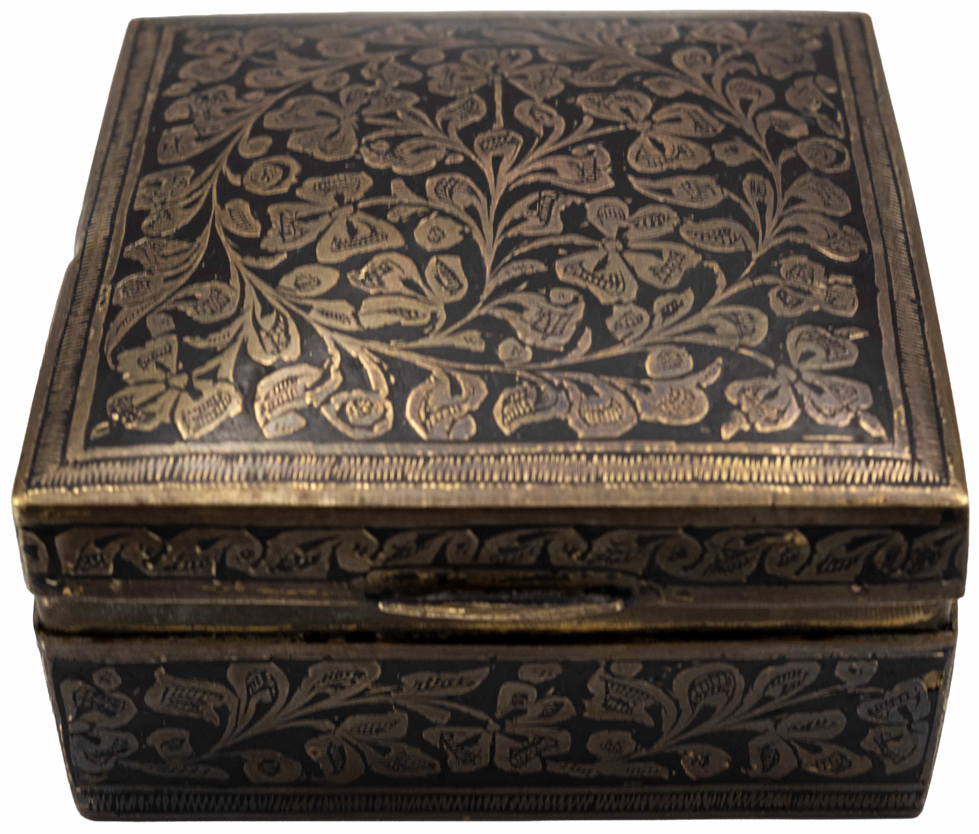 01.18 Casetă pentru țigări, alamă, aplicații de email, lemn Balsa, 8.5x8.5x4.5cm, înc.sec.XX, India, înc.sec.XX