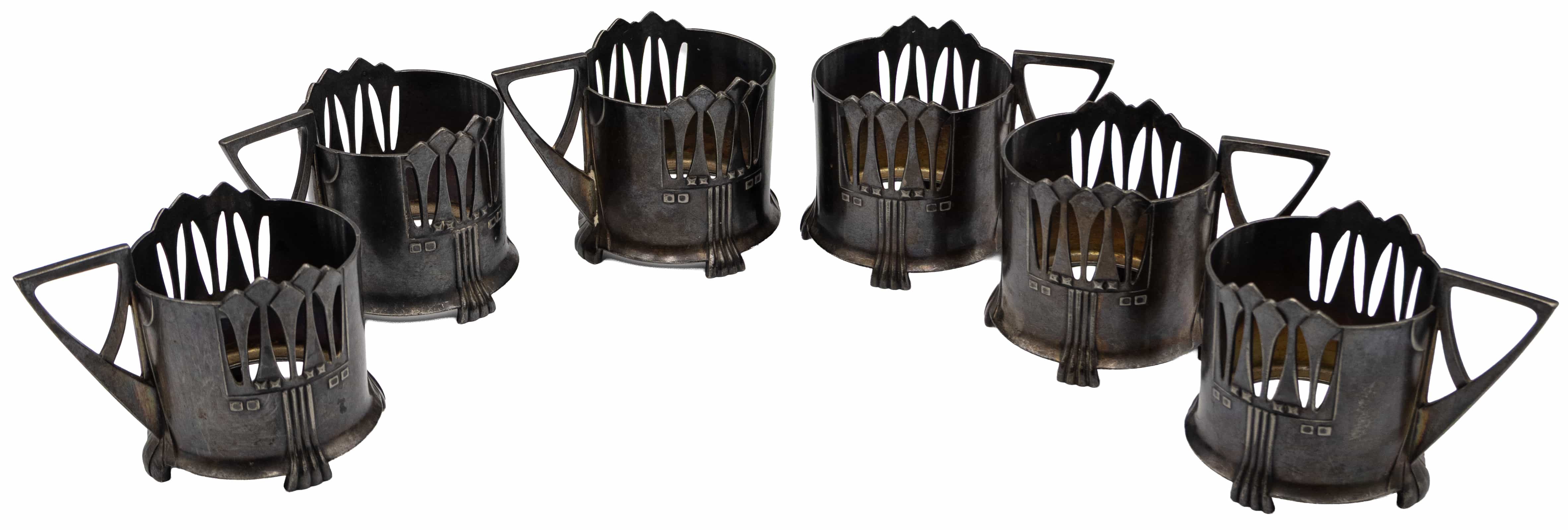 01.19 Șase suporturi pentru pahare, metal placat cu argint, marcate WMF, Jugendstil, înc.sec.XX