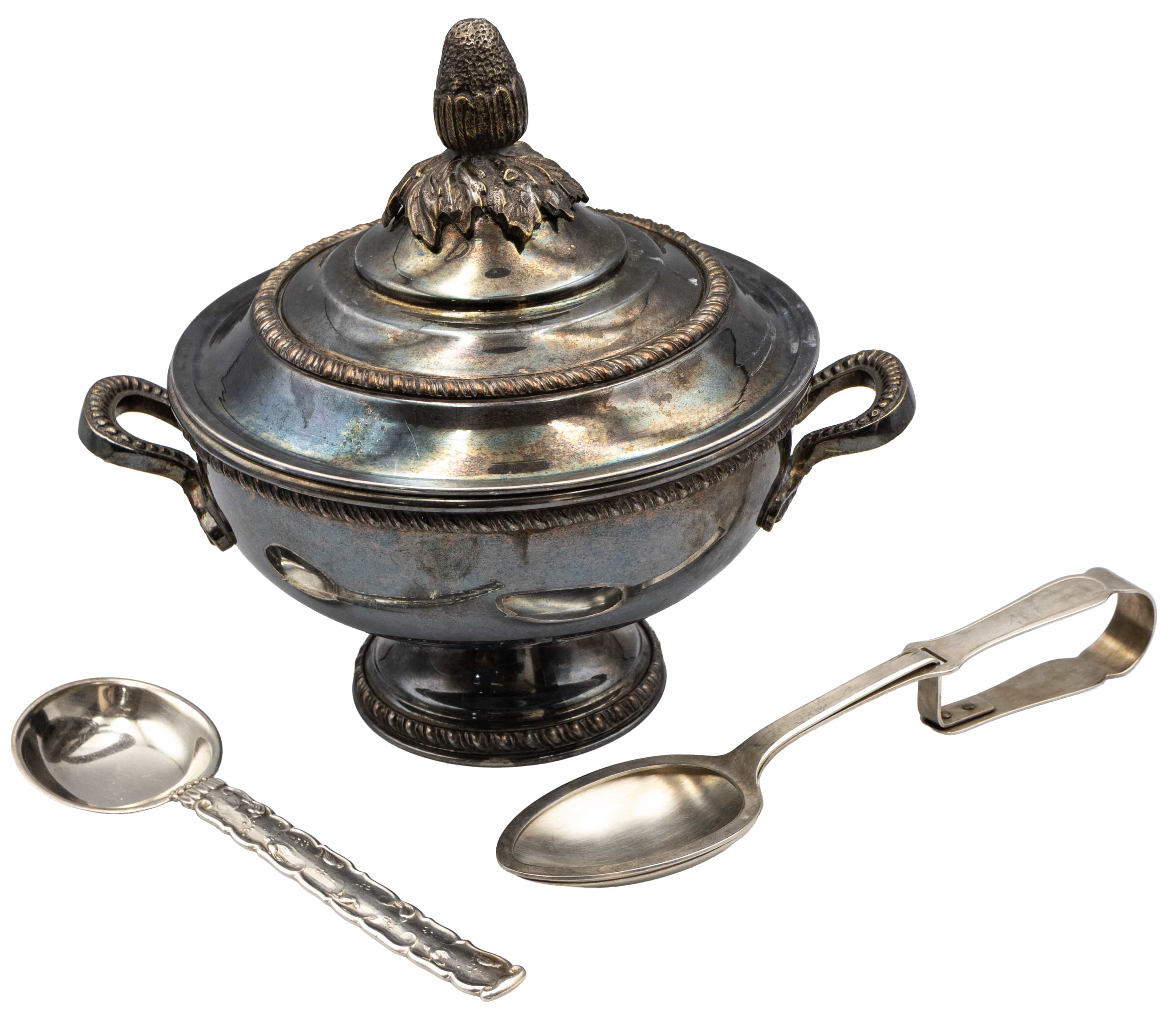 01.23 Castron cu anse și capac și două linguri pentru servit, marcate Wellner și Bruckmann, metal placat cu argint, H 22.5cm (castron), perioada interbelică