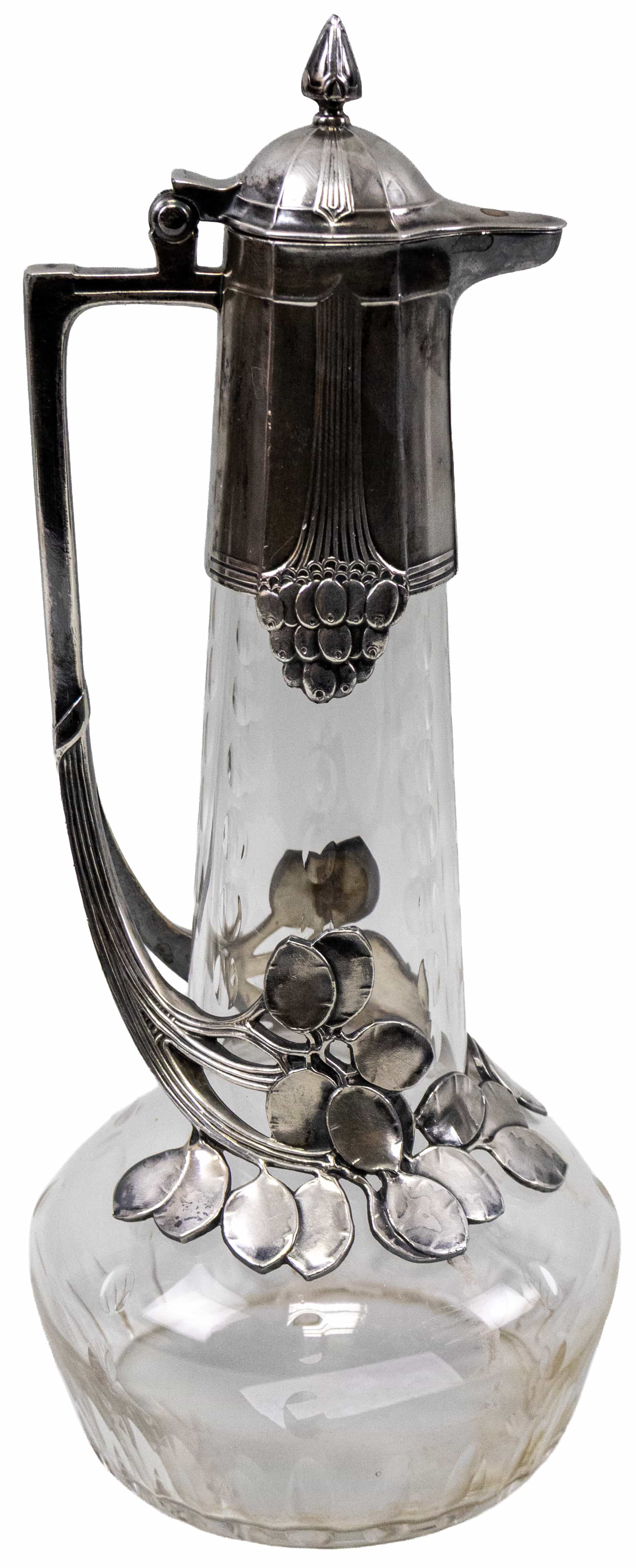 01.24 Carafă cu capac, cristal fasetat, montat în metal , placat cu argint, marcată WMF, Jugendstil, H 24.5cm, înc.sec.XX