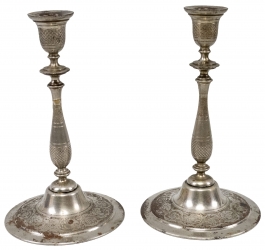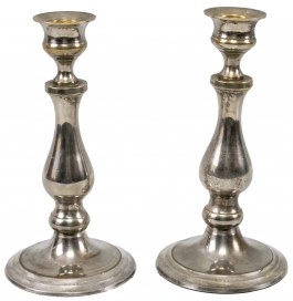 01.04 Pereche de sfeșnice cu o lumină, metal argintat, gravat, marcat, H 22cm, înc.sec.XX