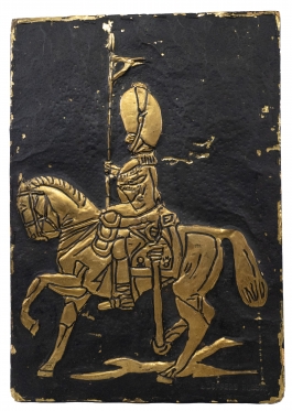 01.05 Husar, panou ornamental de perete, alamă decorată în relief, semnat Goeffers, 40x28.5cm, a II-a jum.sec.XX