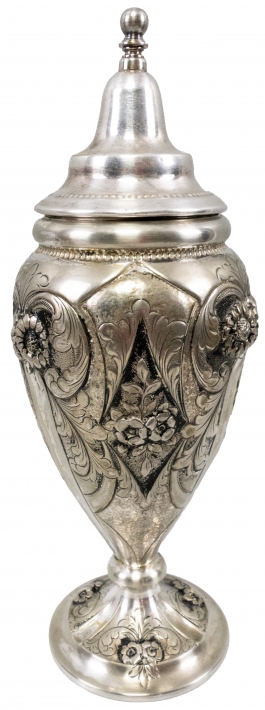 01.10 Vas ornamental cu capac, metal argintat, decorat în relief, H 31 cm, jum.sec.XX
