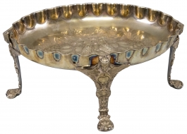 01.02 Fructieră rotundă pe picior, bordură crenelată, metal placat cu argint, decorat în relief, marcată Sheffield, H 19cm, dia.32cm, perioada interbelică
