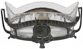 01.11 Fructieră ovală, brodură ondulată, patru piciorușe, cu cariatide, 28x20x12cm, perioada interbelică
