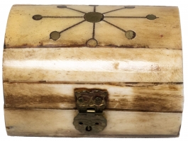 01.26 Casetă, os cu accesorii și intarsii de alamă, 9x7x6,5cm, perioada interbelică