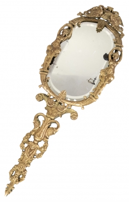 01.32 Oglindă de mână, cristal bizotat în ramă de bronz dore, elemente Empire, H 23cm, cca.1900