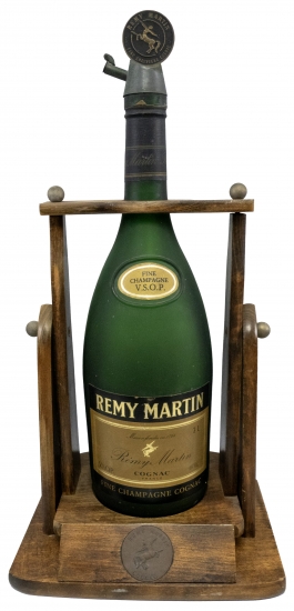 01.36 Recipient pentru coniac Remi Martin, în suport basculant de lemn, H 56cm, a II-a jum.sec.XX