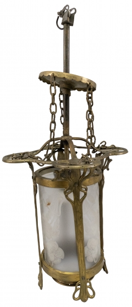 01.38 Lampă de hol, abajur din sticlă atacată cu acid (decor floral), montată în bronz, stil Art Nouveau H 34cm (fără lanțuri), înc.sec.XX