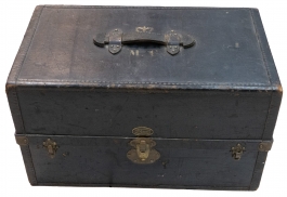 01.39 Cufăr de călătorie, pentru discuri, marcat M.C (a aparținut Prințesei Maruca Cantacuzino), însemn cu coroana regală, piele, lemn și metal, eticheta producătorului P.Romand, Paris, 37x63x37cm, provine din colecția Marina Dimitropoulos