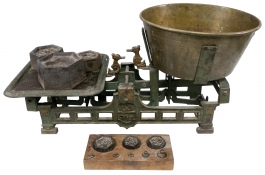 01.01 Cântar balanță, până la 5Kg cu 11 greutăți (5g-2Kg), marca D.V, perioada interbelică