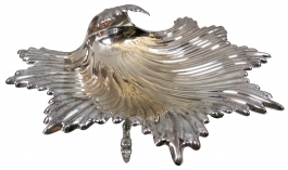01.06 Fructieră pe trei piciorușe (model cochilie), metal argintat, marcată, inscripționată, 35x33cm, jum.sec.XX