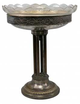 01.07 Fructieră rotundă, patru colonete, alamă argintată, cristal gravat, marcată, H 41.5cm, dia.33,5cm, înc.sec.XX