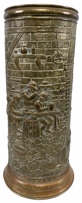 01.08 Suport pentru bastoane și umbrele, decor cu scenă de han, alamă și cupru, H 55cm, perioada interbelică