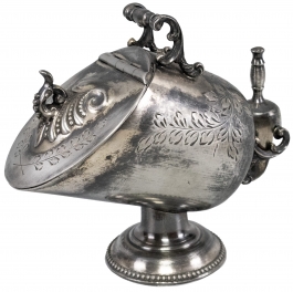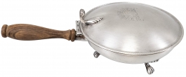 01.25 Tigaie, trei piciorușe, capac gravat cu blazon, metal argintat, mâner lemn, marcată, dia.16cm, perioada interbelică