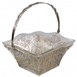 01.14 Coș cu ansă rabatabilă, secțiune pătrată, metal placat cu argint, traforat și cristal gravat, marcat WMF, 17.5x17.5x10cm, perioada interbelică