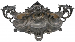 01.15 Jardinieră ovală, cu anse, patru piciorușe, metal patinat, decorat în relief, elemente rococo, 50x21x20cm, Franța, înc.sec.XX