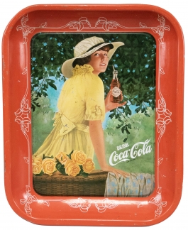 01.16 Tavă pentru servit-reclamă Coca Cola, metal ambutisat și abțibild, 34.5x28cm, perioada interbelică