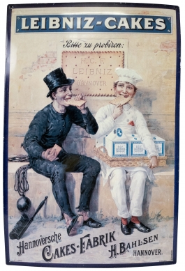 01.18 Panou de reclamă-biscuiți, metal ambutisat, abțibild în culori, 59x39cm, perioada interbelică