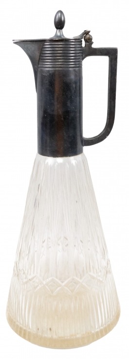 01.22 Carafă cu capac, cristal gravat, montat în metal placat cu argint, marcat WMFB Jugendstil, H 33cm, înc.sec.XX, mic defect la capac