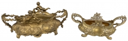 01.23 Două jardiniere ovale, cu anse, patru piciorușe, bronz decorat în relief, L 28/35cm, a II-a jum.sec.XX