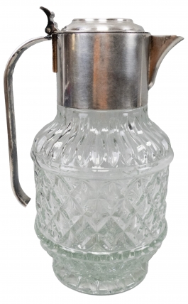 01.26 Carafă cu capac și rezervor pentru gheață, sticlă montată în metal argintat, H 28.5cm, jum.sec.XX