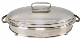 01.28 Legumieră cu capac, sticlă termorezistentă, metal placat cu argint, marcată, 46x26cm, Franța, a II-a jum.sec.XX