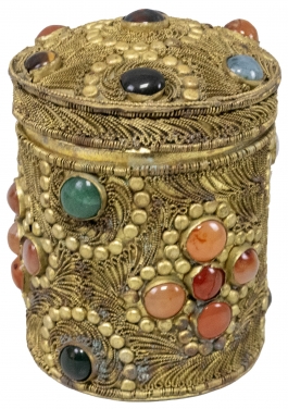 01.31 Casetă cilindrică cu capac pentru țigări, alamă, aplicații de alamă, cabochoane de rocă semiprețioasă, H 10.5cm, perioada interbelică