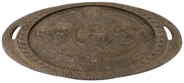 01.11 Tavă ovală cu anse, lemn incizat, stil neoromânesc, 56x31cm, înc.sec.XX