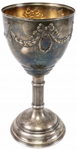 metal placat cu argint, decorat în relief, interior aurit, inscripționat, datat 1926, H 17.5cm