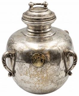 01.22 Vas cu patru anse și capac, decorat cu blazon (în medalion), metal argintat, H 15.5cm, perioada interbelică, mică deformare