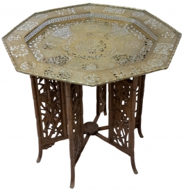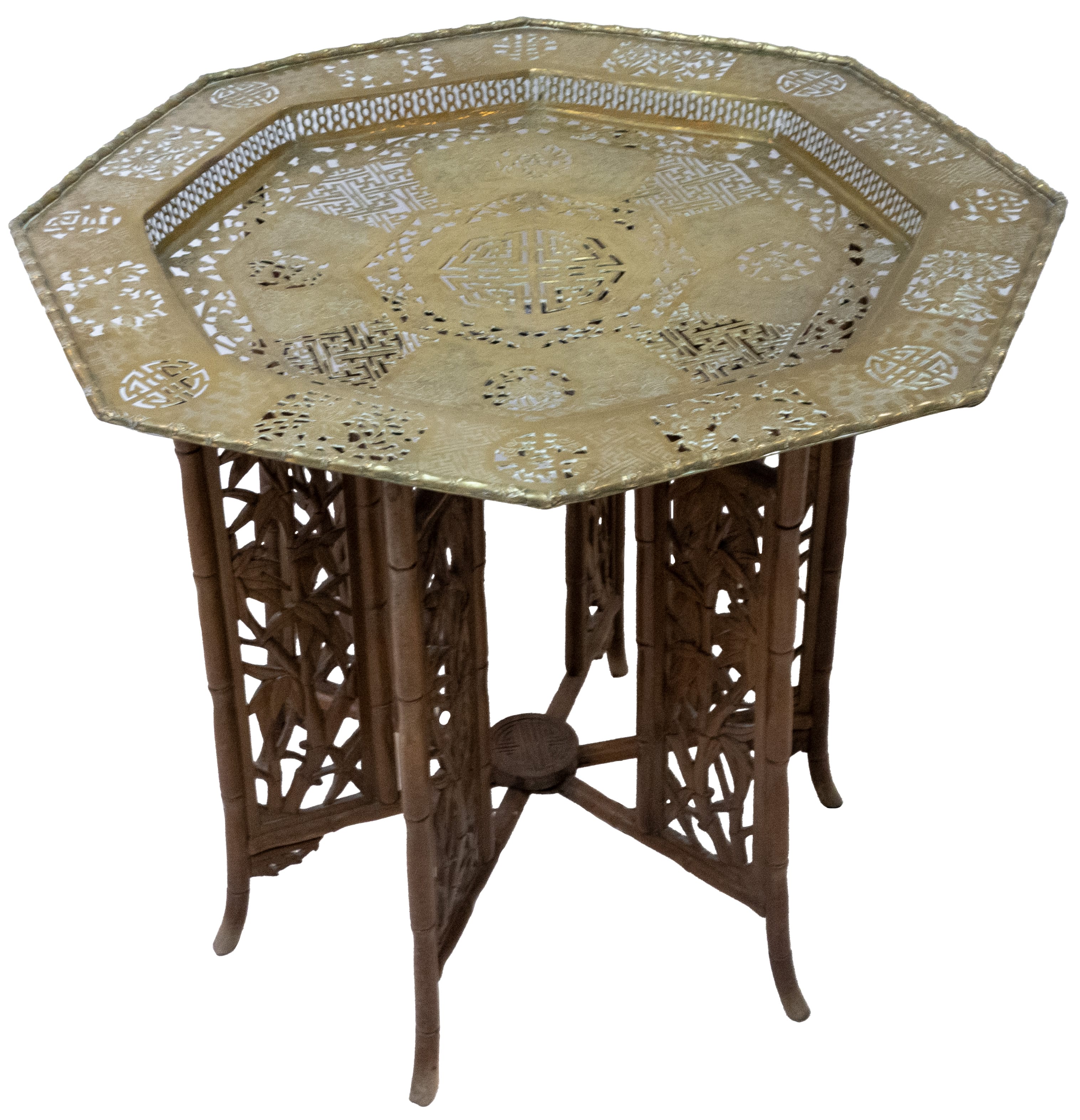 blat poligonal, din alamă traforată, picioare pliabile din lemn traforat și bambus, dia.84cm, H 70cm, Extremul Orient, înc.sec.XX