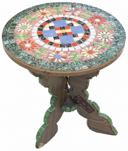 blat rotund, lemn, aplicații de ceramică colorată. dia.47,cm, H 51cm, perioada interbelică