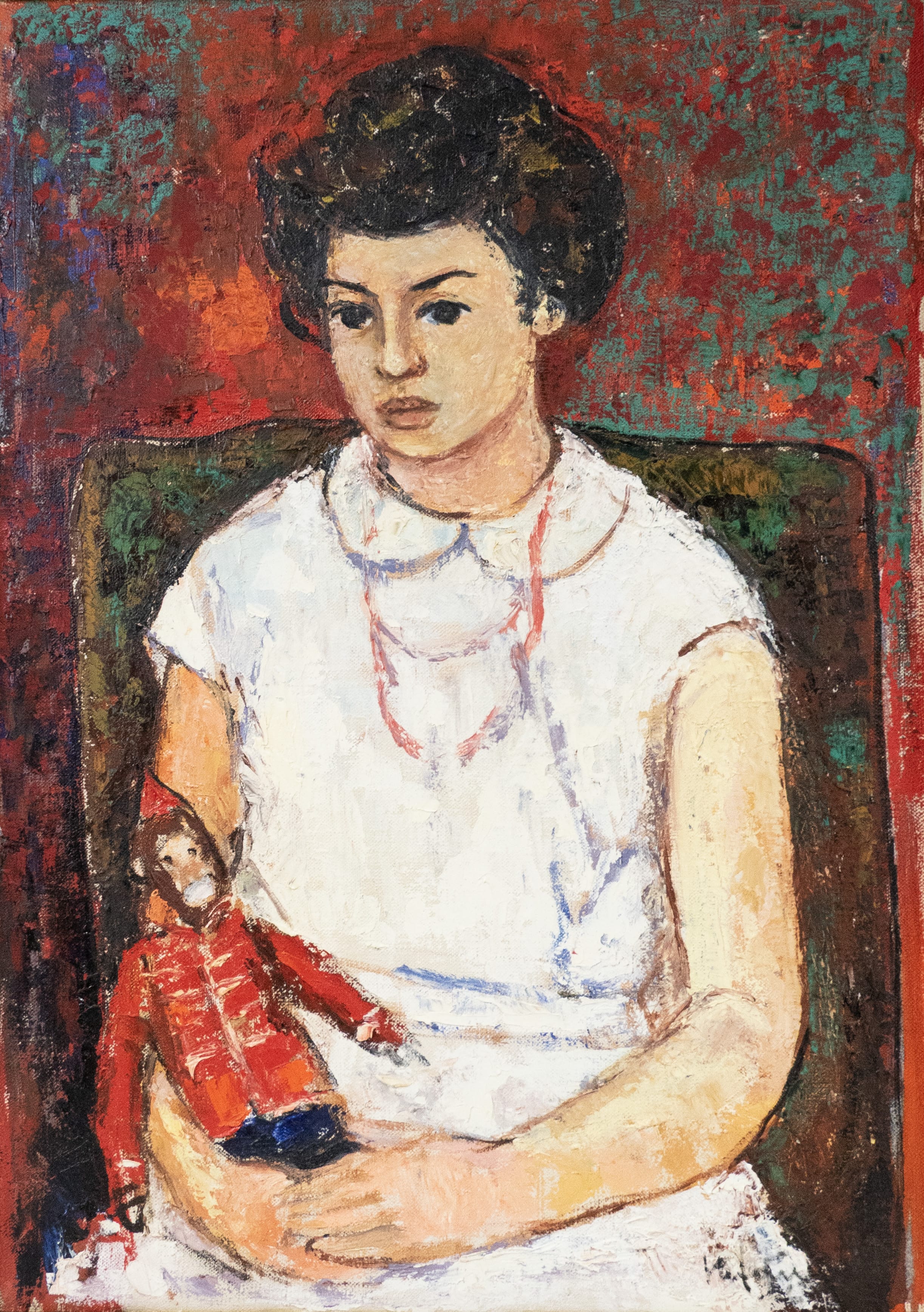 07.28 George Ștefănescu Râmnic (1914-2007) - "Fata cu păpușă", ulei pe pânză, 70x50cm, semnat dreapta jos cu negru