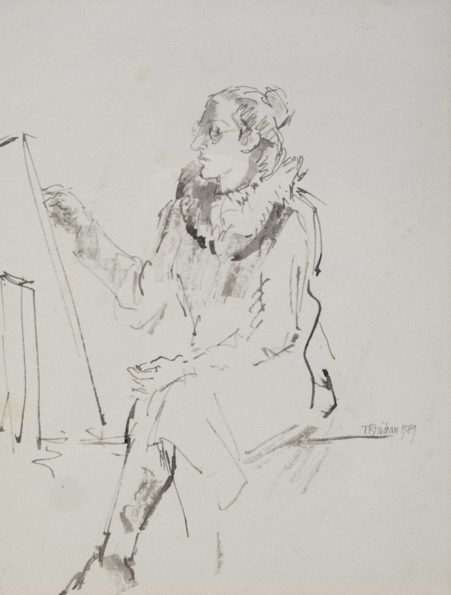 07.02 Traian Brădean (1927-2013) - "În fața șevaletului", tuș, 29.5x22.5cm, semnat lateral dreapta cu tuș, datat1989, provine din colecția Boris Paraschivescu