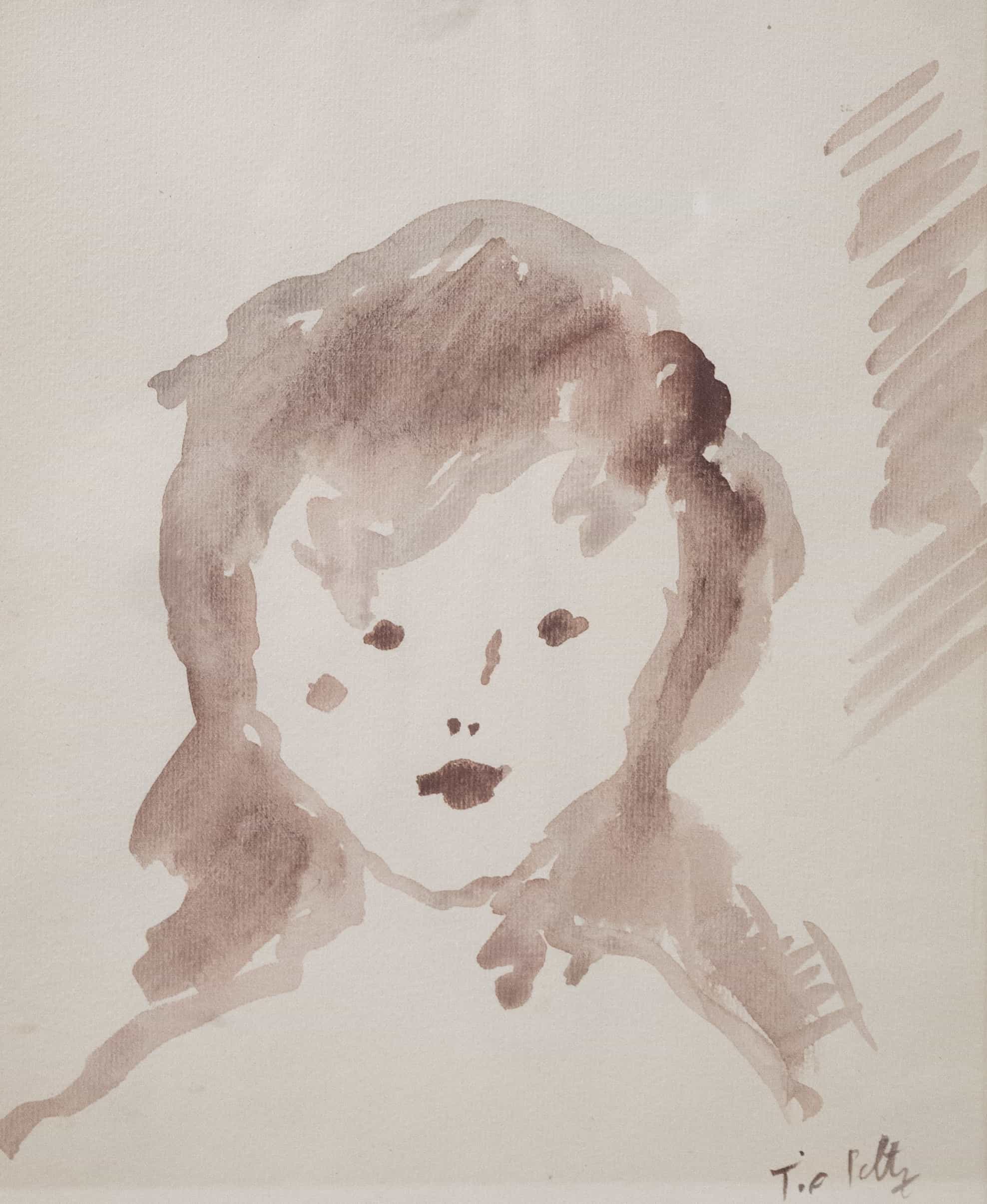 07.04 Tia Peltz (1923-1999) - "Cap de fetiță", tuș (sepia), 27.5x23cm, semnat dreapta jos cu brun