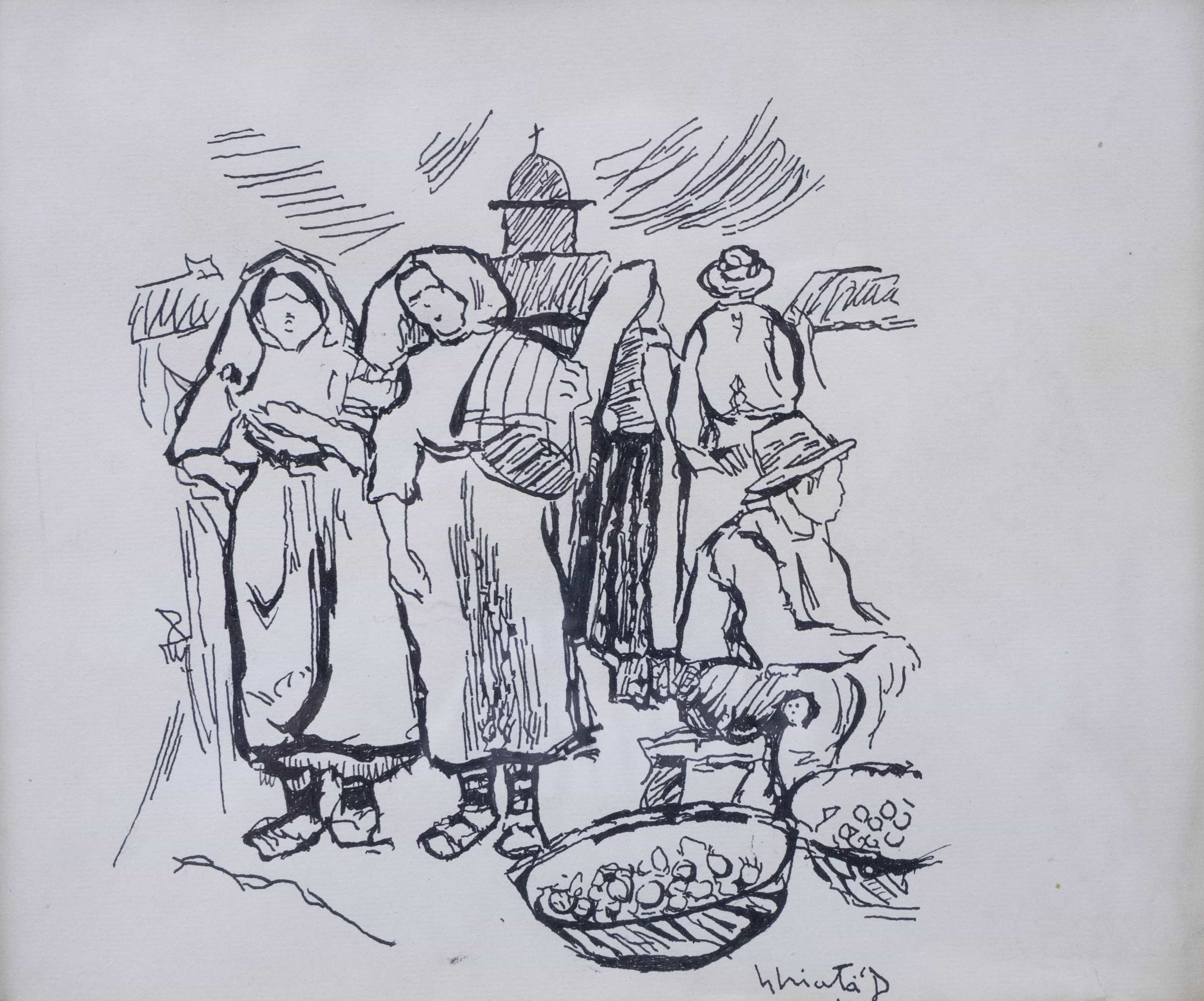 07.16 Dumitru Ghiață (1888-1972) - "Târg", tuș, 22.5x27.5cm, semnat dreapta jos cu tuș, provine din colecția Boris Paraschivescu