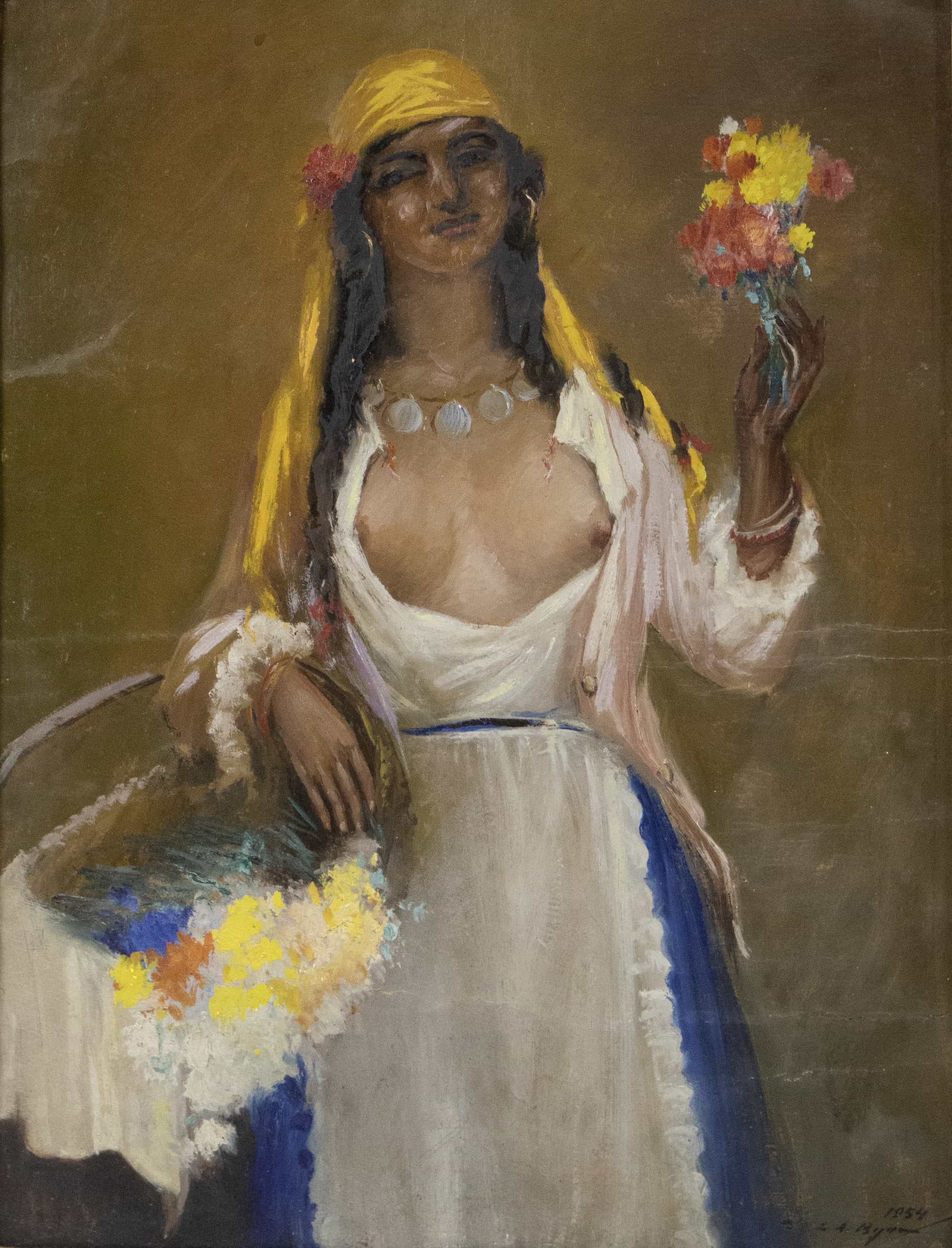 07.17 Leon A.Biju (1880-1970) - "Florăreasă", ulei pe carton, 64x48.5cm, semnat dreapta jos cu negru, datat 1954