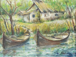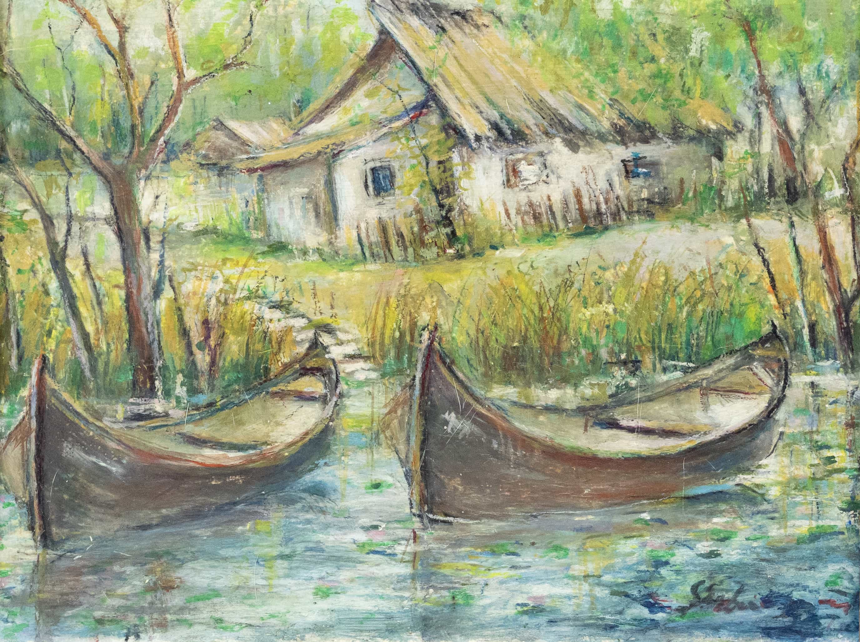 07.18 Gheorghe Sârbu (1883-1955) - "Bărci în Deltă", ulei pe carton, 35x47.5cm, semnat dreapta jos cu negru