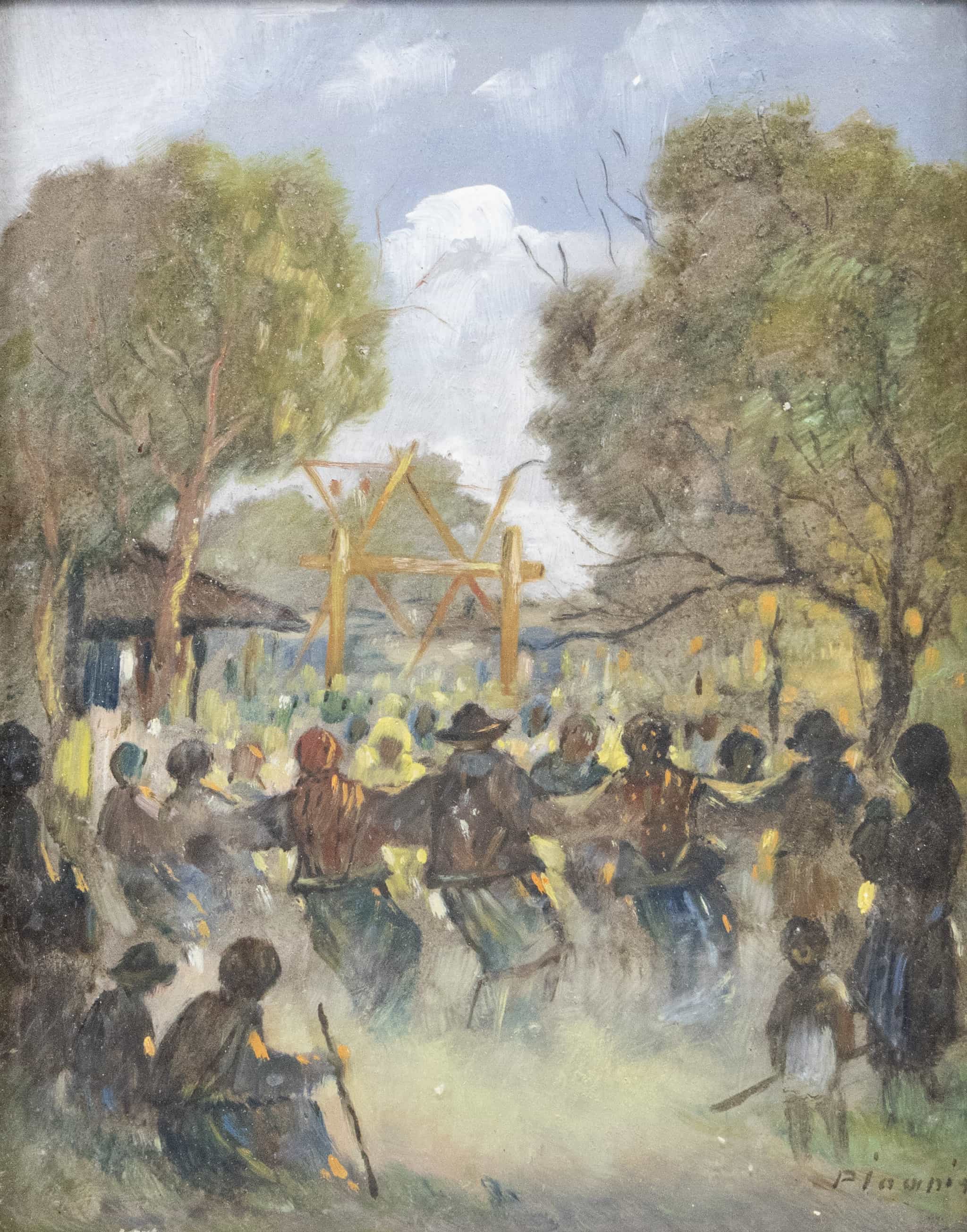 07.19 Pan Ioanid (1879-1956) - "Horă la bâlci", ulei pe carton, 31x24cm, semnat dreapta jos cu negru