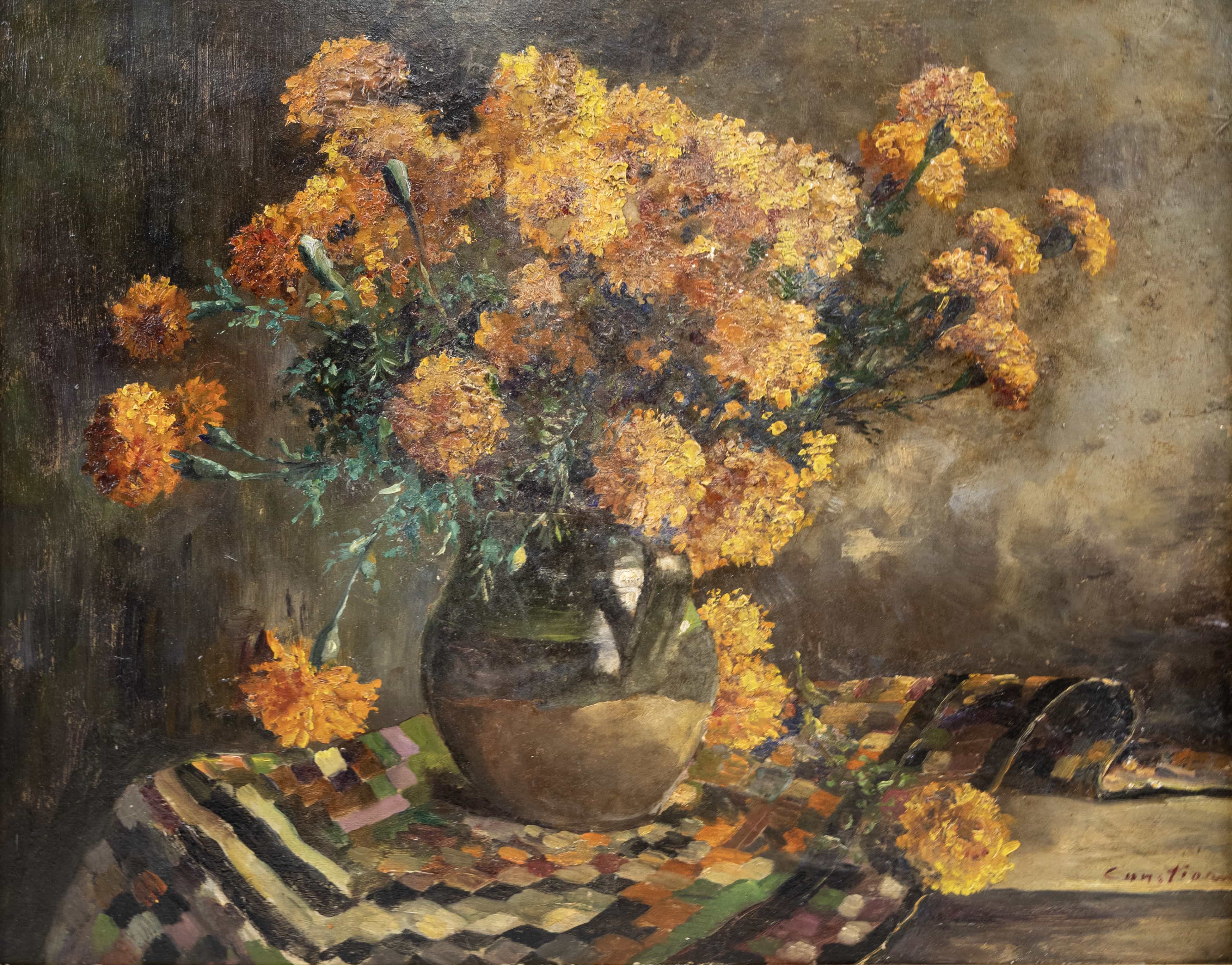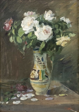 07.40 Theodor Cateliu (1852-?) - "Ulcică cu trandafiri", ulei pe carton, 60s43cm, semnat dreapta jos cu roșu
