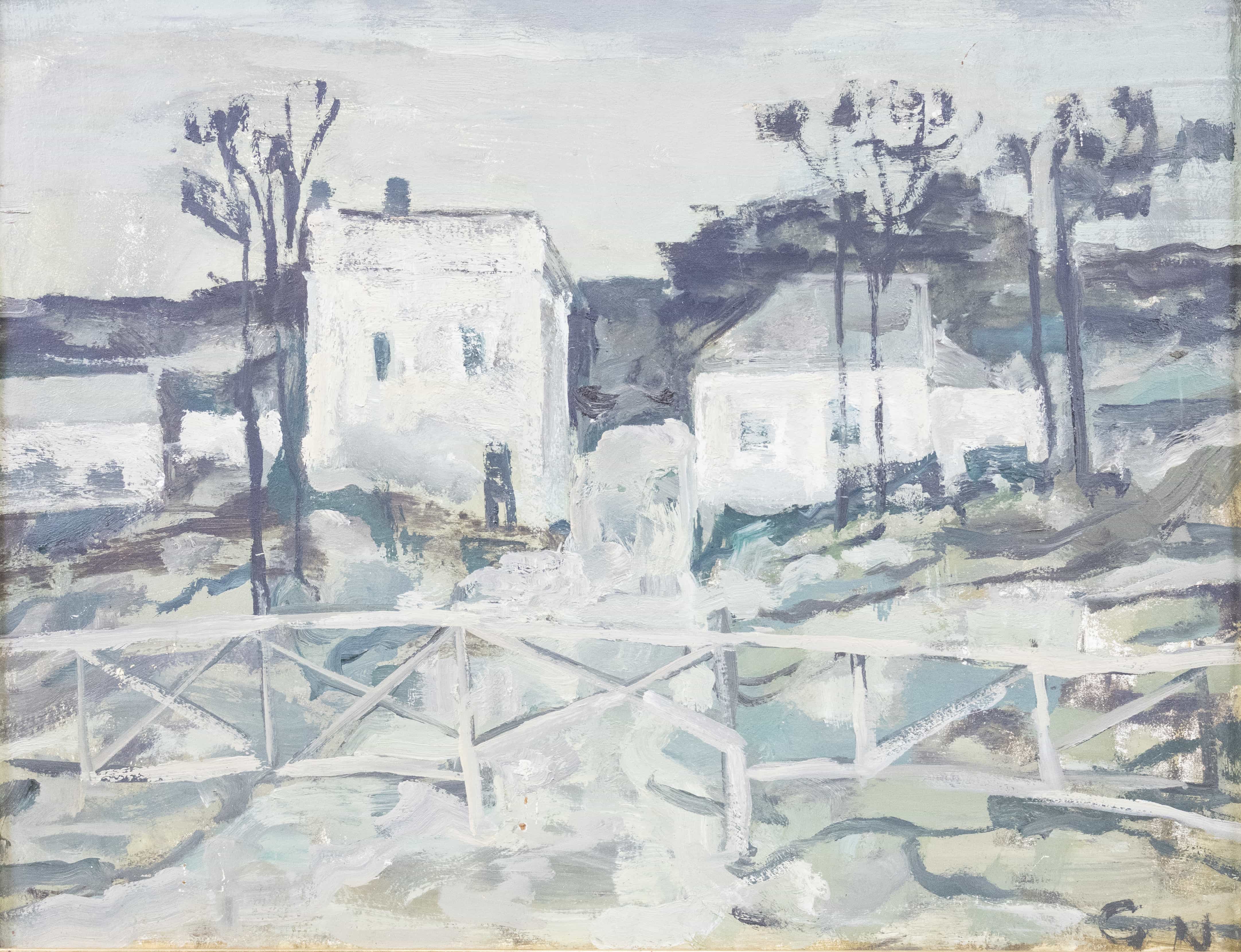 07.22 Nicolai Georgescu (1946-1995) - "Peisaj cu case și podeț", ulei pe carton, 50x65cm, semnat dreapta jos cu inițiale