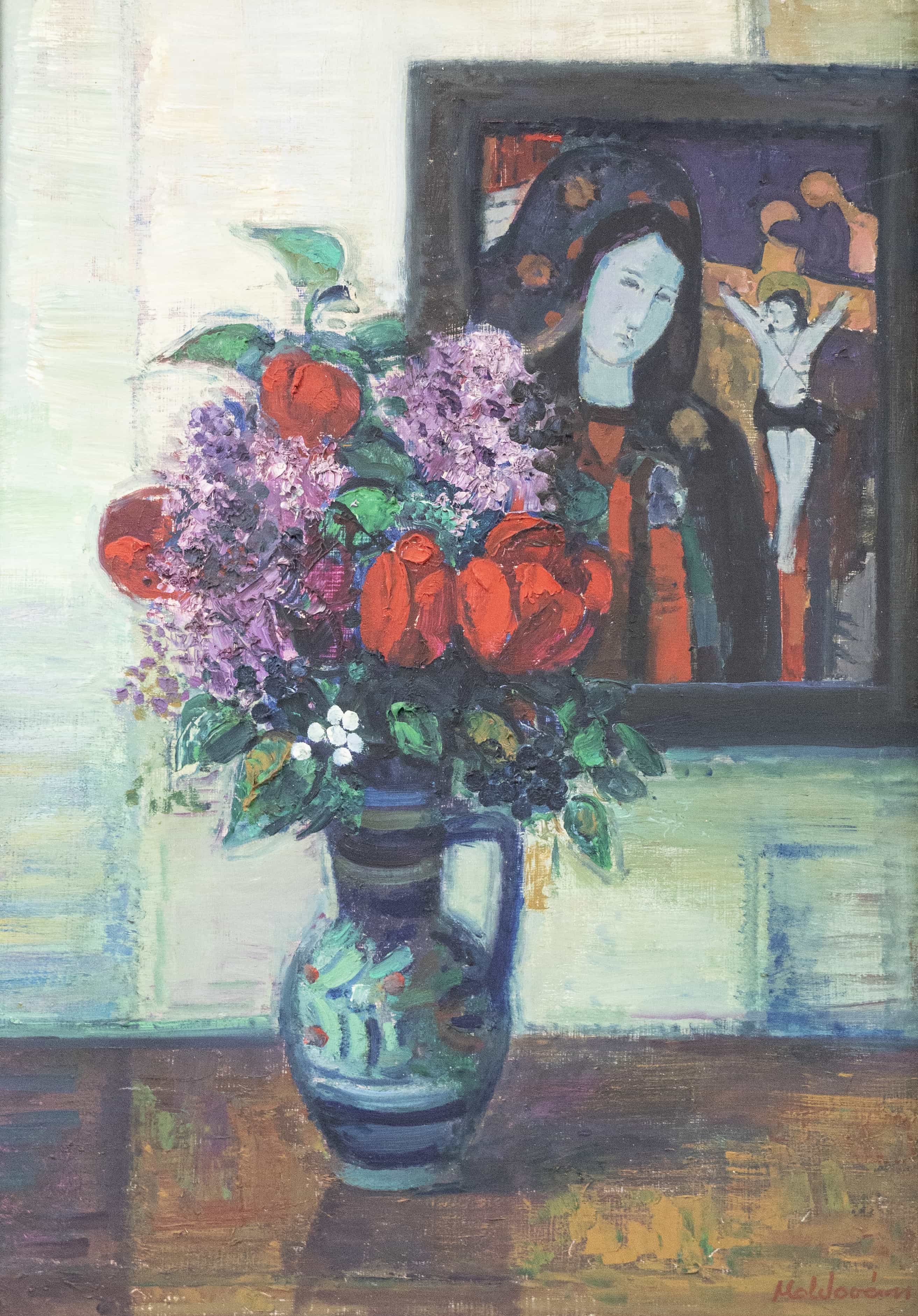 07.26 Moldovan Istvan (1911-2000) - "Natură statică cu flori și icoană", ulei pe carton, 70x50cm, semnat dreapta jos cu roșu