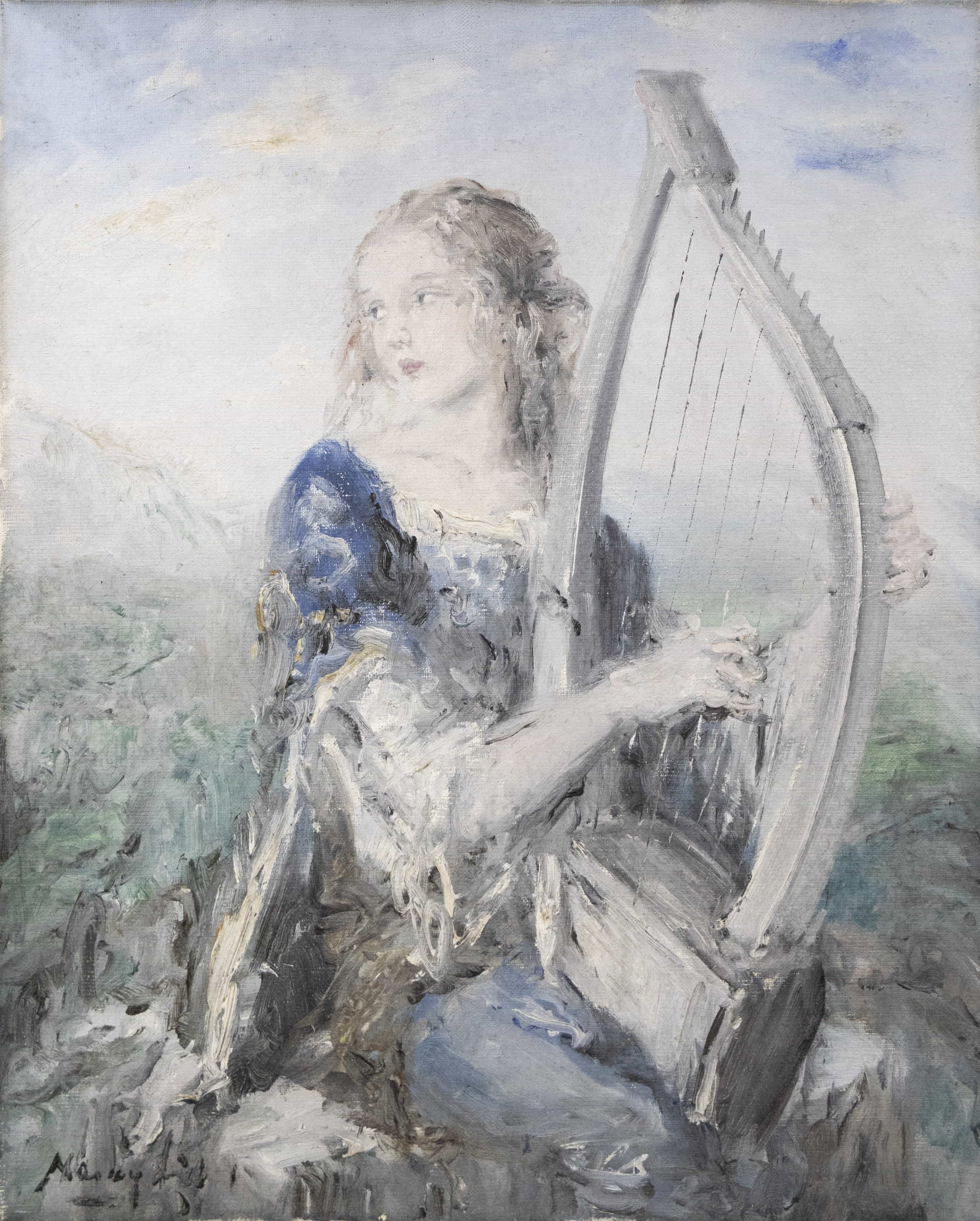 07.35 Naray Aurel (1883-1948) - "Fată cu harfă", ulei pe pânză, 68x55.5cm, semnat stânga jos cu negru, fără ramă
